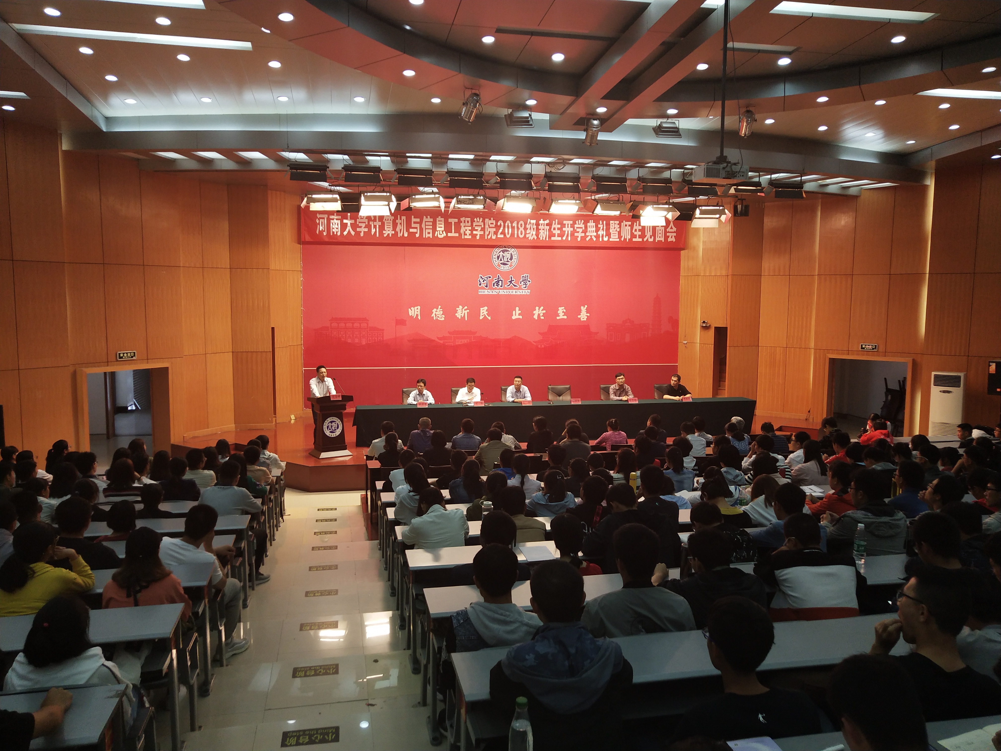 金明校区计算机大楼二楼报告厅举行。学院党委书记吕冰、院长乔保军、党委副书记柯杨、副院长曹志伟、韩道军、胡振涛全体院领导班子、教师代表、以及近500名研究生和本科生新生出席典礼。典礼由院党委副书记柯杨主持。
