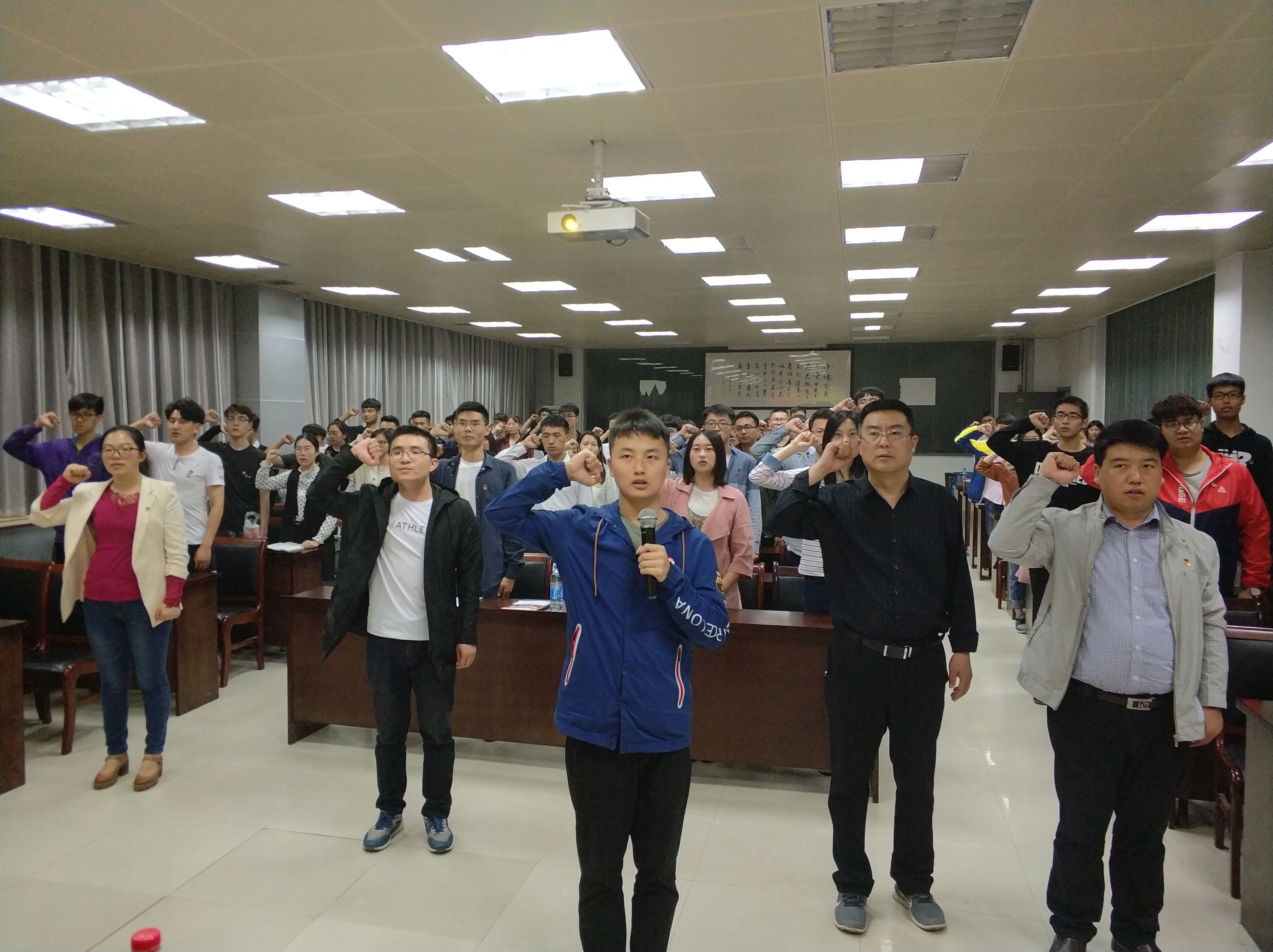 学生会团委副书记、青马班班长夏雷雨同学领誓,全场肃立,场上响起庄严的共青团入团誓词。不忘初心,方得始终,大抵如此。仪式进行第七项,全体奏唱中国共产主义青年团团歌。