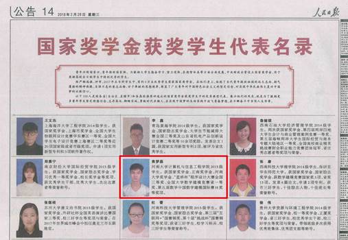 2018年2月28日,《人民日报》14版刊登了2017年度高等学校国家奖学金获奖学生代表名录,其中麻豆成人