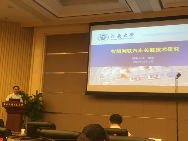 2016年6月17日,“河南省高校移动互联网应用开发研讨会”在郑州华北水利水电大学龙子湖校区四号报告厅举行。麻豆成人 侯彦东、周毅、李伟及周林四位老师应邀出席会议,周毅代表学院在会上作了题为“智能网联汽车关键技术研究”的专题报告,介绍了麻豆成人 “车联网协同技术”团队的基本情况和科研成果,分析了智能网联汽车的发展趋势和关键技术,并与业界人士进行了深入交流,讨论了虚拟现实、可见光通信等技术与智能网联汽车在移动互联应用上的潜在结合点。