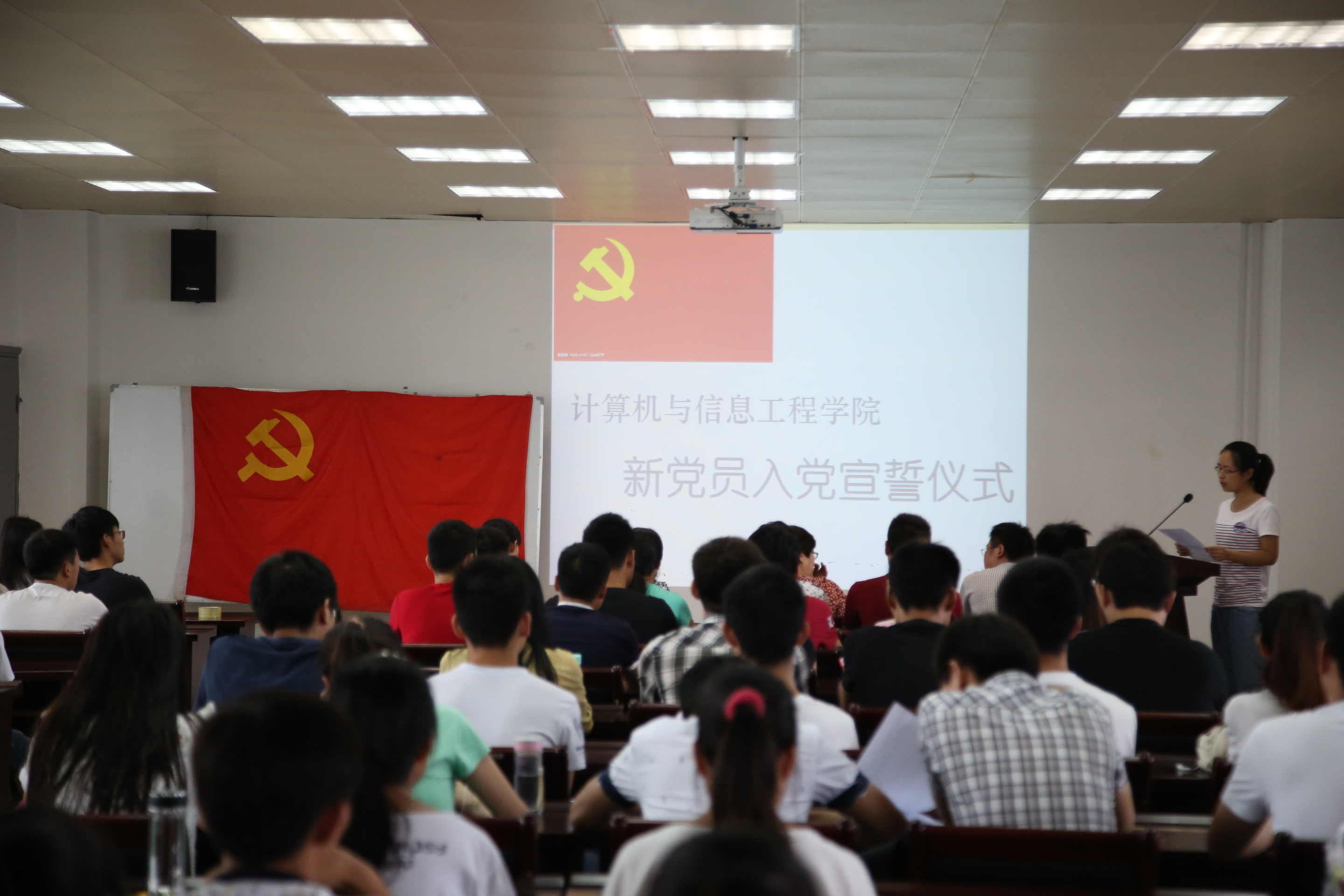 在计算机大楼603教室隆重集会,举行新党员入党宣誓仪式,以庄严的誓词迎接党的生日。学院党委书记辛占香、全体辅导员、73名新党员以及入党积极分子代表参加了宣誓大会。会议由学院党委副书记孔涛主持。
