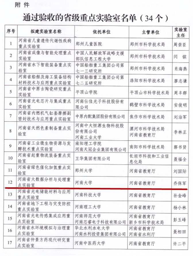 2017年获批建设的大数据分析与处理河南省重点实验室通过了省科技厅组织的验收。