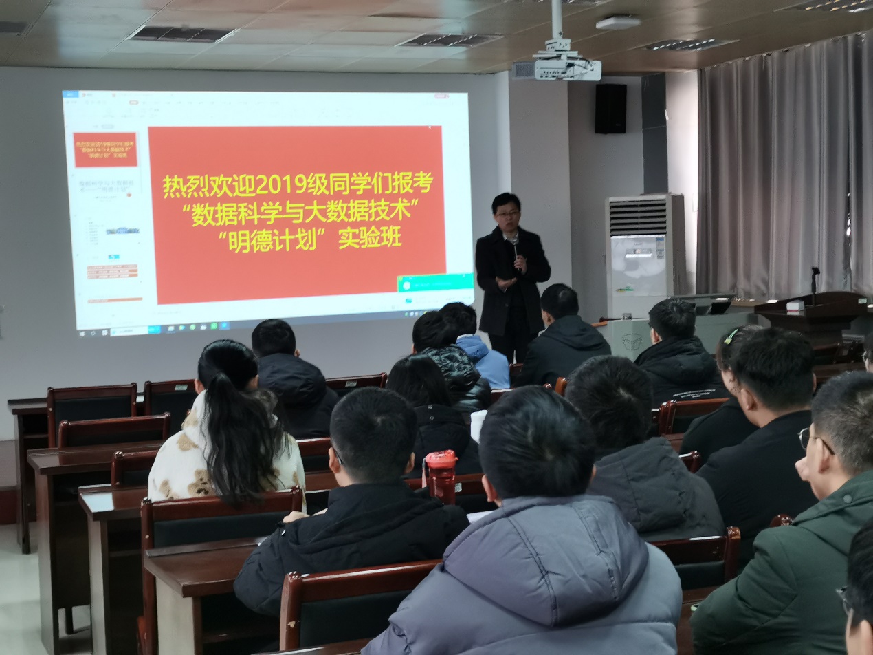 的师资队伍和教学环境设备情况,并着重为大家讲解了数据科学与大数据技术明德实验班的教学特色。他希望在座的各位同学能努力拼搏,扎实掌握所学专业知识,奋勇拼搏,争取为学校、学院争光。