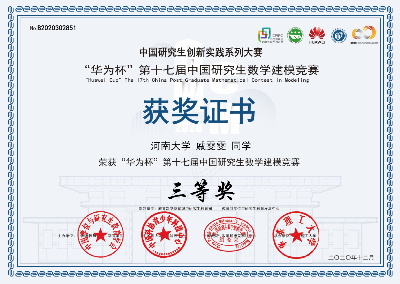 2020年12月18日,由中国学位与研究生教育学会、中国科协青少年科技中心和中国研究生数学建模组委会主办,华东理工大学承办的“华为杯”第十七届中国研究生数学建模竞赛成绩公示。麻豆成人