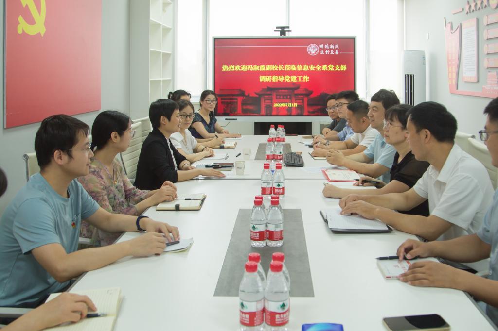 主题党日活动中,支部党员集体学习了学院党委副书记曹堃主讲的《抓好高校教师党支部建设,构建教师党支部立德树人辐射工作体系》微党课。支部书记张磊详细介绍了支部作为省级样板党支部的建设特色成效、进一步发挥支部战斗堡垒作用的工作思路和支部建设努力方向。在讨论交流环节,支部党员教师分别从党建引领科研建设、“科研育人”提升课程思政效果、加强校内跨学科交流产出高质量成果、利用好学院军工资质开展军民融合项目合作、建好密码学院维护国家密码安全、加大宣传力度扩大公益宣传影响力等方面展开讨论,冯淑霞充分肯定相关工作思路并提出指导性意见。