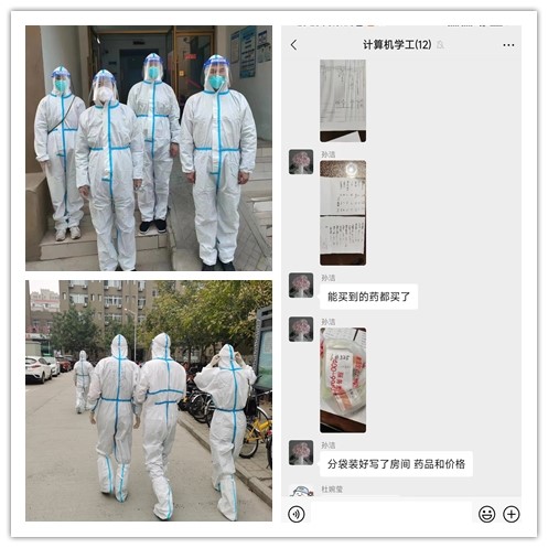 学院党委书记吕冰、副院长柯杨、辅导员孙洁、行政人员肖天杰,他们化身“大白”抗战在防疫第一线。每天早上六点就身穿防护服,一趟趟往返于东苑宿舍各个楼层,为学生送上美味可口的饭菜。他们是守护员,力所能及地帮助学生购买药品和生活必需品。他们是传递员,帮助学生从实验室向宿舍传递书籍等学习用品。他们是安全员,不做志愿服务时,巡视学院楼上楼下消防安全。“一定要尽我们最大的努力,守护好我们的每一位学生”,吕冰多次向学院志愿者强调。56岁的他每天都住在学院办公室,穿着防护服一日三餐为学生们送餐,笑称自己能跑得比年轻人还快,能最早把餐送完。志愿者孙洁说:“每次穿上防护服,都觉得责任重大,和学院其他志愿者一同把餐食送到学生手里、帮同学们购买急需药品,也会由衷的感到使命光荣。希望同学们对疫情防控期间的管理要求多些理解、多些支持,坚定信念、积极配合,共同抗疫,早日取得胜利!”