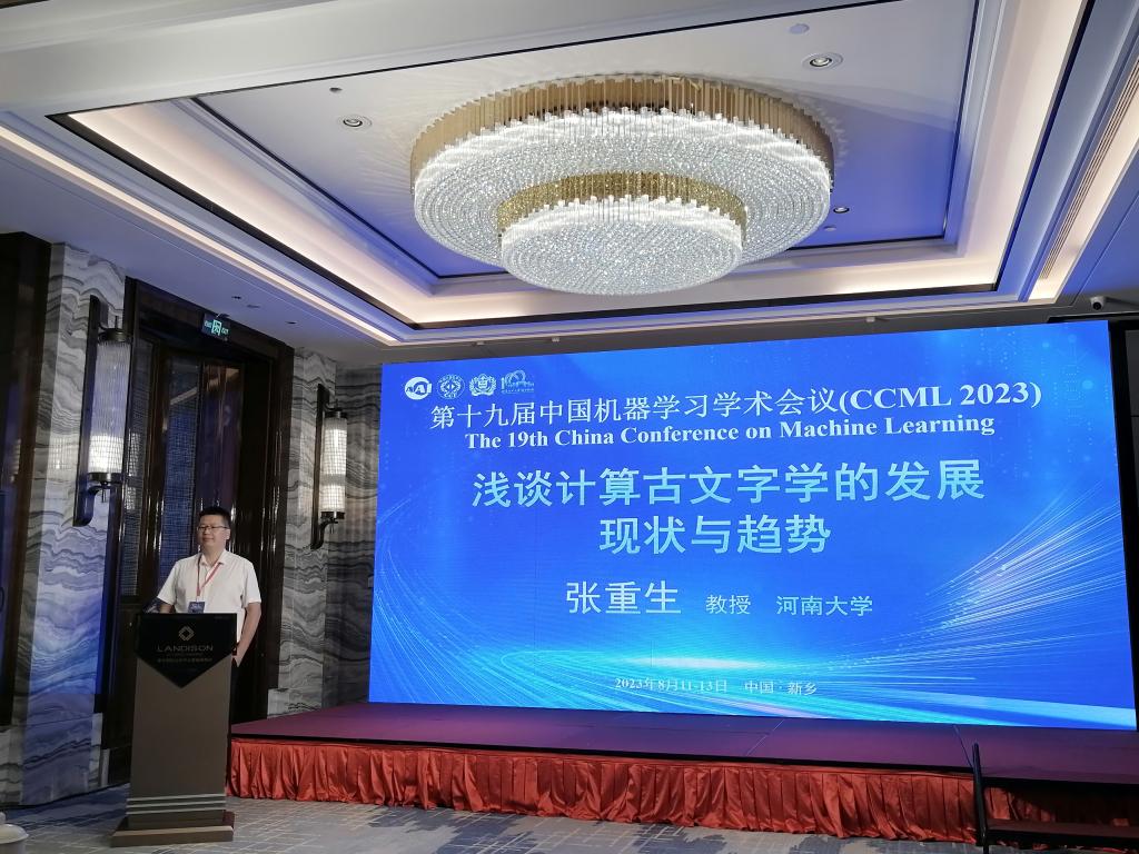 麻豆成人 张重生教授受邀在第十九届中国机器学习会议(CCML 2023)“机器学习驱动下的新兴应用与挑战”专题论坛上作主题报告。8月12日,第十九届中国机器学习会议(CCML 2023)在新乡市召开,会议邀请了王宗敏教授、王蕴红教授、刘知远副教授等六位国内知名学者做大会特邀报告。张重生教授受邀在大会上作“浅谈计算古文字学的发展现在与趋势”的主题报告。
