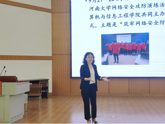 信息安全系主任杜晓玉向本科新生详细介绍了学院专业特点、课程设置、实验设备、学习方法等,并与同学们亲切互动。信息安全系谢毅老师给研究生强调了科学研究中的团队协作能力,鼓励大家加强团队协作,实现合作共赢。党委办公室负责人杜婉莹为新生详细讲解了入党流程及要求,鼓励新生听党话、跟党走。教务办副主任刘宇为本科新生详细讲解了培养方案和教学管理制度。学院资助工作负责人孙洁为新生解读了学校资助政策,鼓励大家珍惜学习机会,遇到困难及时向学院求助。数据科学系张重生老师就如何提高科研创新能力,给研究生进行了辅导。
