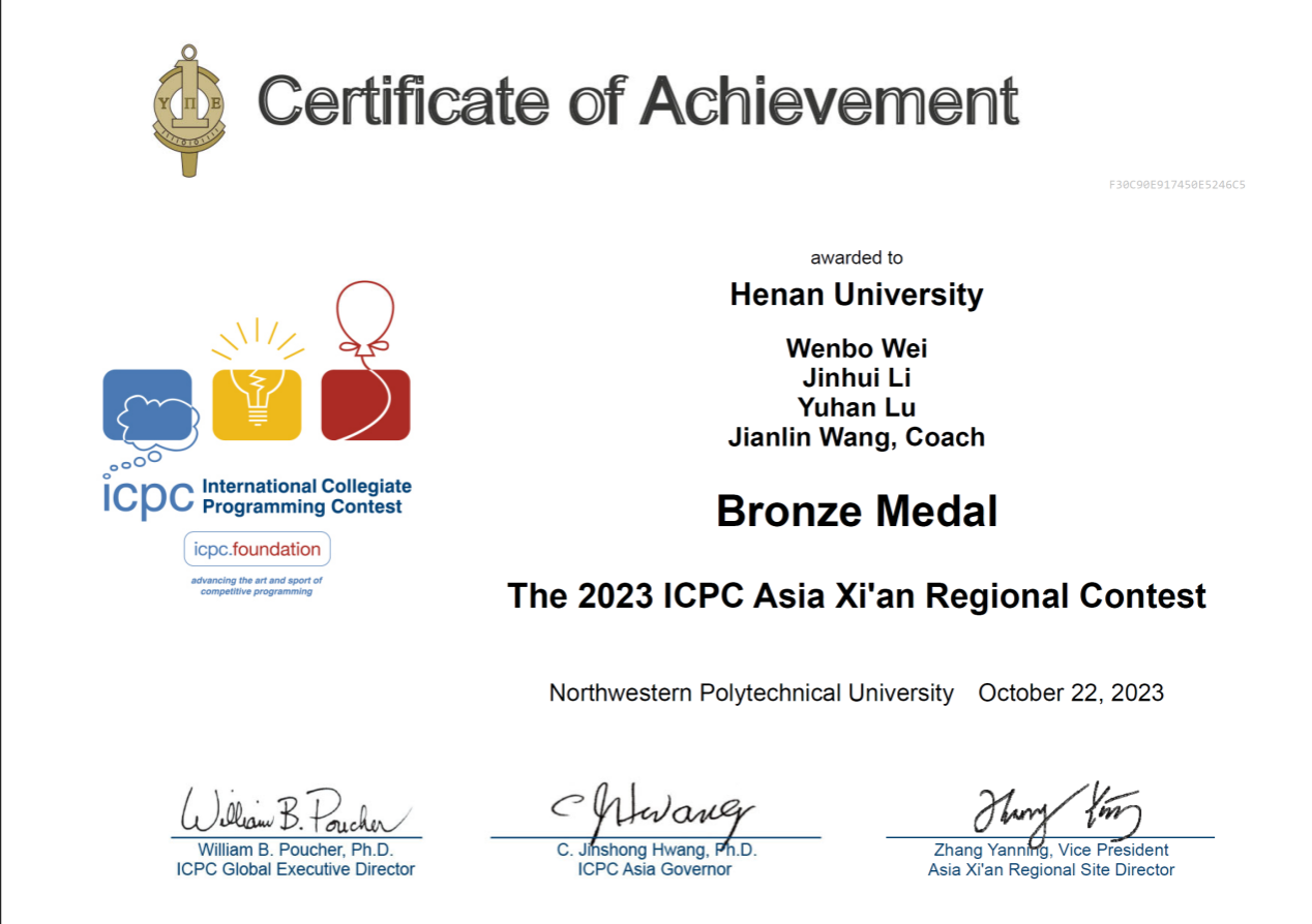 2023年10月22日,第48届ICPC国际大学生程序设计竞赛亚洲区域赛(西安)在西北工业大学长安校区举行,来自213所高校、406支队伍的1500余名师生参赛。来自我学院2022级学生魏文博、李锦辉、卢语涵组成的队伍代表学校参赛,指导教师为王建林老师。经过五个小时激烈的角逐,麻豆成人