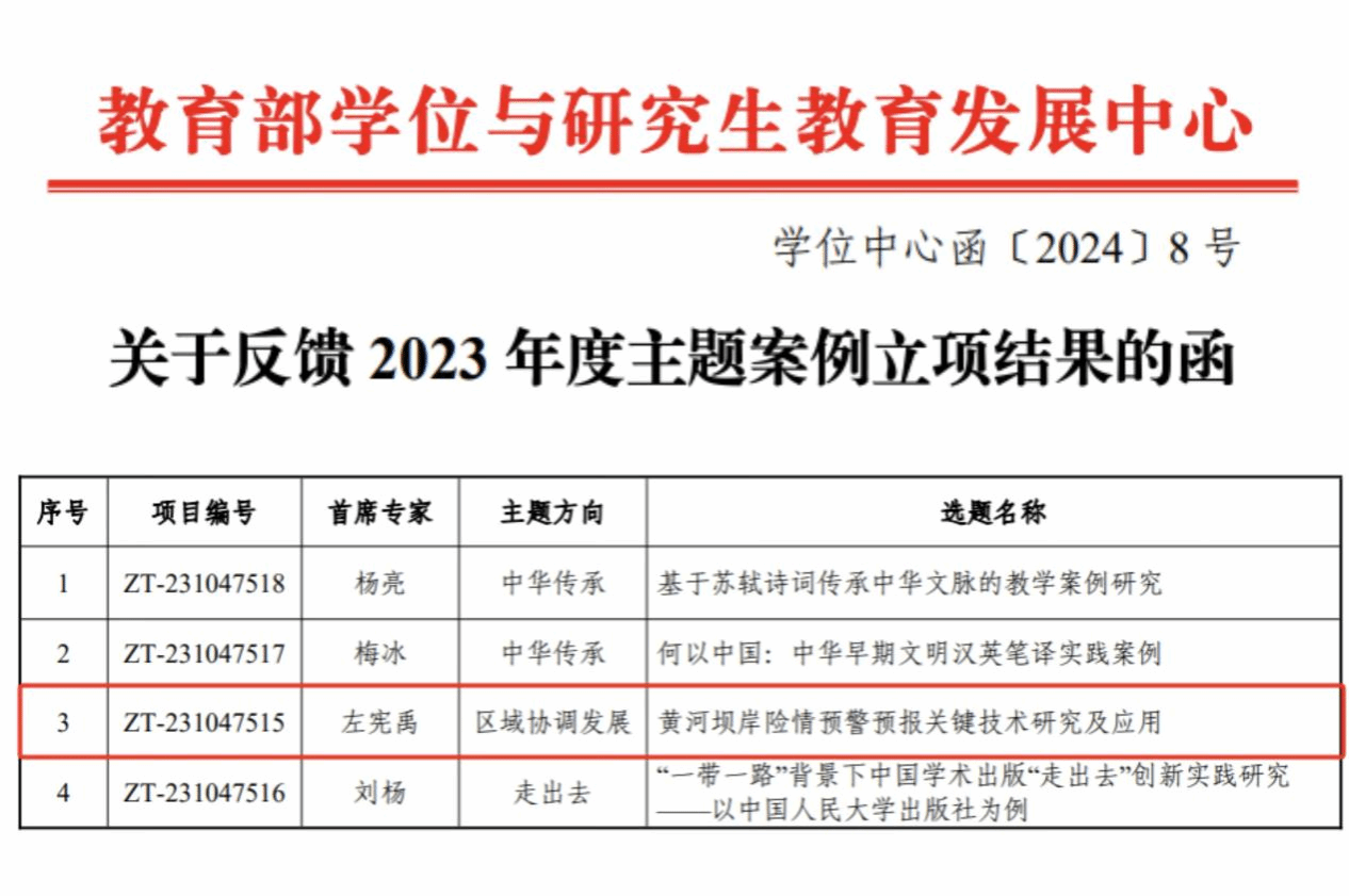 左宪禹教授担任首席专家的案例《黄河坝岸险情预警预报关键技术研究及应用》(项目编号:ZT-231047515)成功立项。此次立项项目隶属于“区域协调发展”主题,项目成果已由黄河河务局在郑州马渡、开封黑港口、兰考东坝头等区域投入使用,有效的发现多起险情,获得水利部和黄委会主要领导的好评。研究成果方面,共申请获批相关专利8项、软著2项、发表高水平论文3篇,为形成教学和科研案例打下了良好基础。