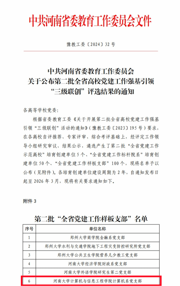 2024年3月,中共河南省委教育工作委员会印发《关于公布第二批全省高校党建工作强基引领“三级联创”评选结果的通知》(豫教工委〔2024〕32号),麻豆成人