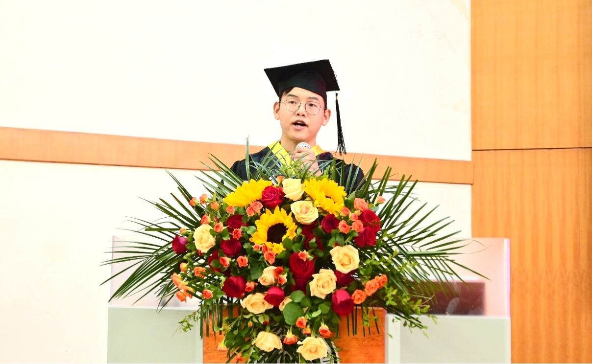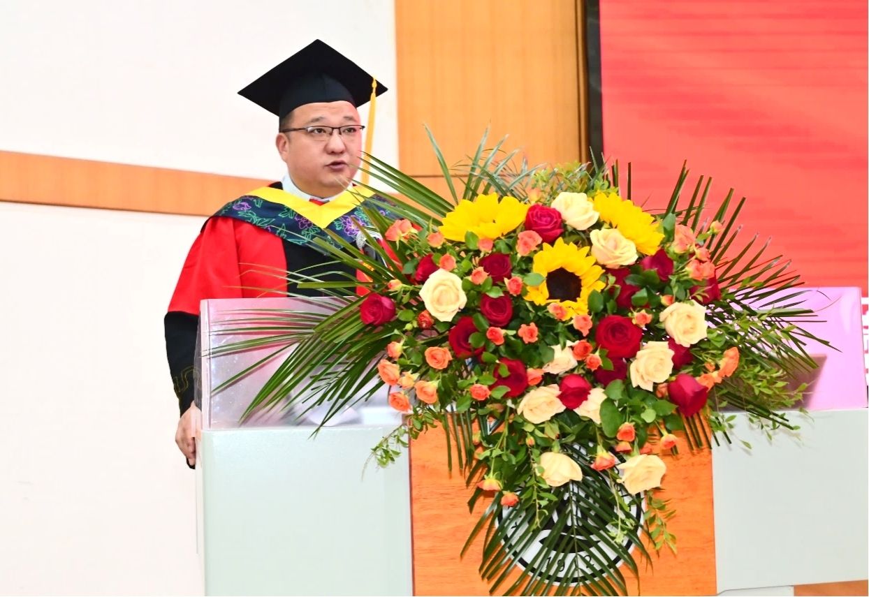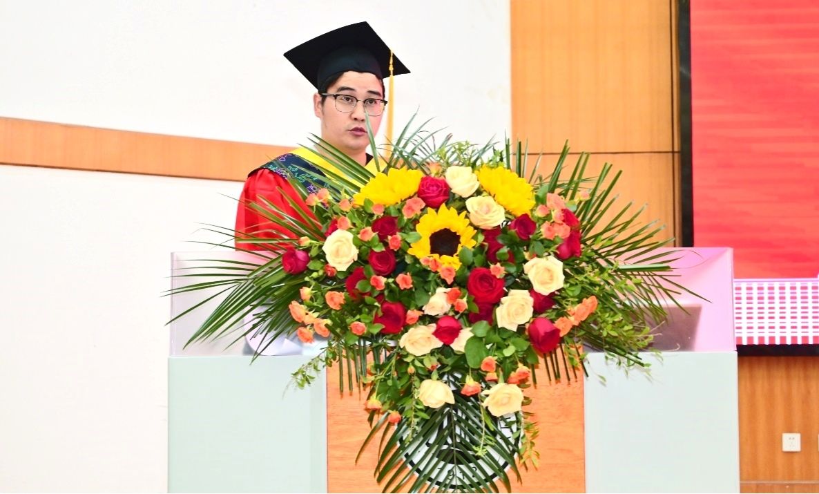 毕业生代表2020级常英波在发言中对四年来学校、学院的倾心培养表达深深的谢意,并号召同学们厚植家国情怀,以永不熄灭的青春热忱,奋力书写为中国式现代化挺膺担当的青春篇章!