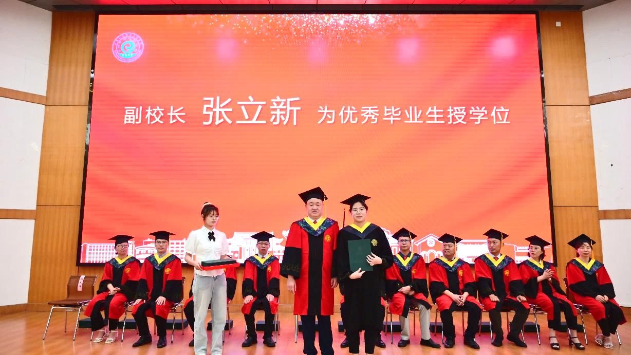 副校长张立新为学院优秀毕业生援正流苏,颁发学位证书,并合影留念。随后,学院领导班子成员和学位评定分委员会成员集体为毕业生援正流苏,颁发学位证书。