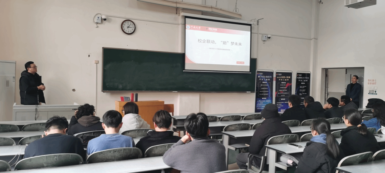 在计算机楼102教室举办河南鸿钇科技校企交流就业讲座,鸿钇科技公司主讲人田阳为学院2025届本科毕业生介绍了鸿钇科技公司的主要业务情况、社会就业环境和公司招聘需求,主讲人杨兆从简历撰写技巧、劳动合同签订、五险一金等方面做了细致的讲解。