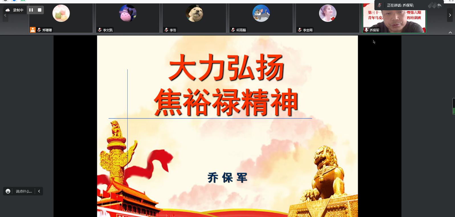 学院党委委员、院长乔保军以“焦裕禄精神”为题,从焦裕禄的生平简介、焦裕禄精神的科学内涵、焦裕禄精神的时代价值、怎样弘扬焦裕禄精神四个方面讲解。他表示焦裕禄精神永远是亿万人民心中一座永不磨灭的丰碑,学习焦裕禄精神要深学、细照、笃行,内化于心,外化于行。学习弘扬焦裕禄精神,重点要学习弘扬焦裕禄同志“心中装着全体人民、唯独没有他自己”的公仆情怀,凡事探求就里、“吃别人嚼过的馍没味道”的求实作风,“敢教日月换新天”、“革命者要在困难面前逞英雄”的奋斗精神,艰苦朴素、廉洁奉公、“任何时候都不搞特殊化”的道德情操。要从焦裕禄精神中汲取力量,锤炼坚强党性,牢记初心使命,忠诚履职尽责。