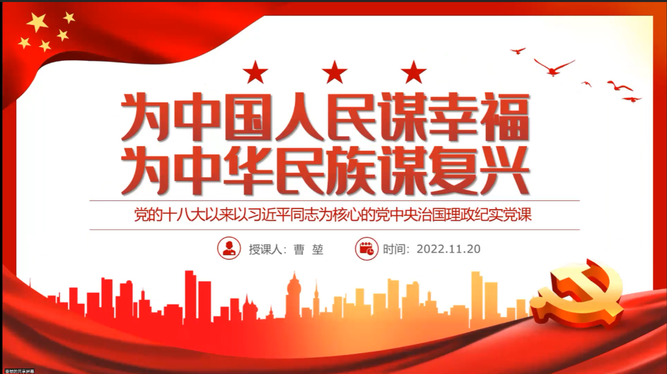 24日上午,学院党委副书记曹堃以“为中国人民谋幸福,为中华民族谋复兴——党的十八大以来以习近平同志为核心的党中央治国理政纪实”为题,从旗帜鲜明坚持和加强党的全面领导、坚持以人民为中心的发展思想、着眼国家治理体系和治理能力现代化、构建新发展格局、意识形态领域形势、坚持底线思维和忧患意识、统筹国内国际两个大局、牢牢把握新时代新征程党的中心任务八个方面讲解。他表示,新时代党和国家事业之所以能够取得历史性成就、发生历史性变革,根本在于习近平总书记掌舵领航,在于习近平新时代中国特色社会主义思想科学指引。新时代新征程上,在以习近平同志为核心的党中央坚强领导下,风华正茂的中国共产党必将带领全国各族人民,为全面建设社会主义现代化国家、全面推进中华民族伟大复兴继续团结奋斗。