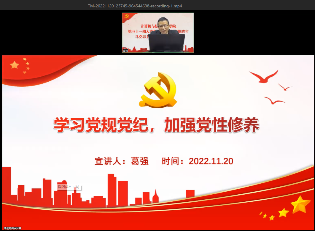 学院党委委员、副院长葛强以“学习党规党纪,加强党性修养”为题,从解读法纪内涵、维护党章权威、加强党性修养、严守党规党纪、学习党规党纪、规范日常行为六个方面讲解。他表示,纪律是党的生命线,是管党治党的重器,加强纪律建设是全面从严治党的治本之策。深入学习党章党规党纪,严明政治纪律、严守政治规矩,将廉洁自律强化于身,是每一位党员必须做到的。他指出,入党积极分子要通过念好思想认识的“紧箍咒”,筑牢艰苦朴素的“防火墙”,绷紧公权私利的“警戒线”,把稳服务同学的“方向盘”,不断规范日常行为,加强党性修养,争取早日加入党组织。