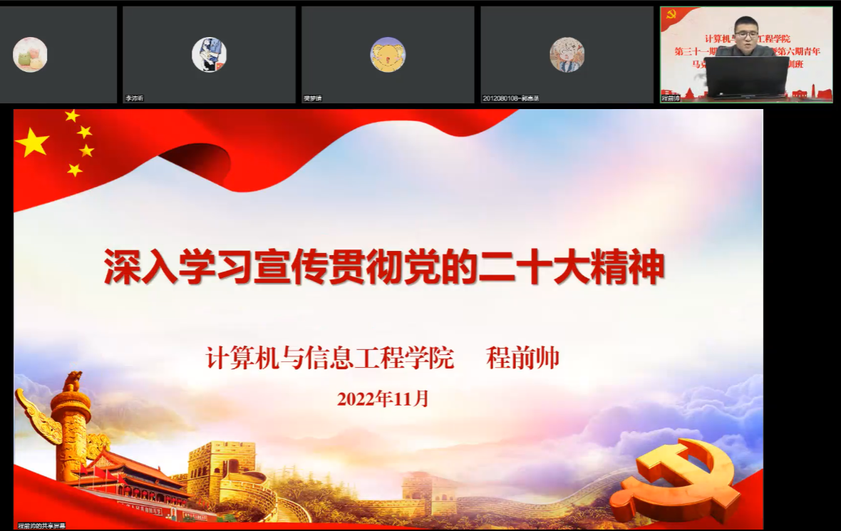 24日下午,省派第一团支书、学院党委委员、团委书记程前帅以“深入学习宣传贯彻党的二十大精神”为题,为全体学员带来党的二十大精神宣讲。他指出,青年强,则国家强。新时代青年生逢其时,施展才干的舞台无比广阔,实现梦想的前景无比光明,青年人要学会把握新时代赋予的机遇,主动增强社会责任感和历史使命感,埋头苦干,奋勇向前,在实现第二个百年奋斗历史征程中大展手脚,让青春在全面建设社会主义现代化国家的火热实践中绽放绚丽之花。他表示,希望学员们认真学习领会二十大精神,利用返家乡、寒假社会实践机会积极开展党的二十大精神宣讲,把学习宣传带回家乡,普惠乡亲。