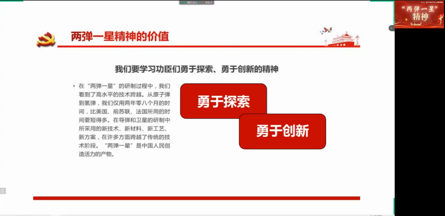 24日晚上,学院党委委员、副院长左宪禹以“两弹一星精神”为题,从“两弹一星”精神的形成、“两弹一星”精神的内涵、“两弹一星”精神的价值和弘扬“两弹一星”精神四个方面展开讲解。他强调,“两弹一星”精神是我国老一辈科学家在自主完成原子弹和氢弹爆炸、导弹飞行和人造卫星发射的过程中,自觉培育践行的一种崇高精神,是爱国主义、集体主义、社会主义精神和科学精神的突出体现,是中国人民在社会主义建设时期为中华民族创造的宝贵精神财富。他表示,作为新时代青年,要传承好、发扬好“两弹一星”精神,把“热爱祖国、无私奉献,自力更生、艰苦奋斗,大力协同、勇于登攀”融入平时的学习生活中,为实现中华民族伟大复兴贡献力量。