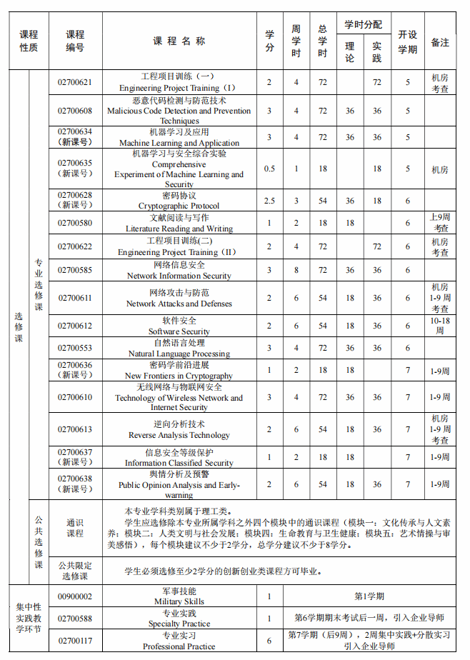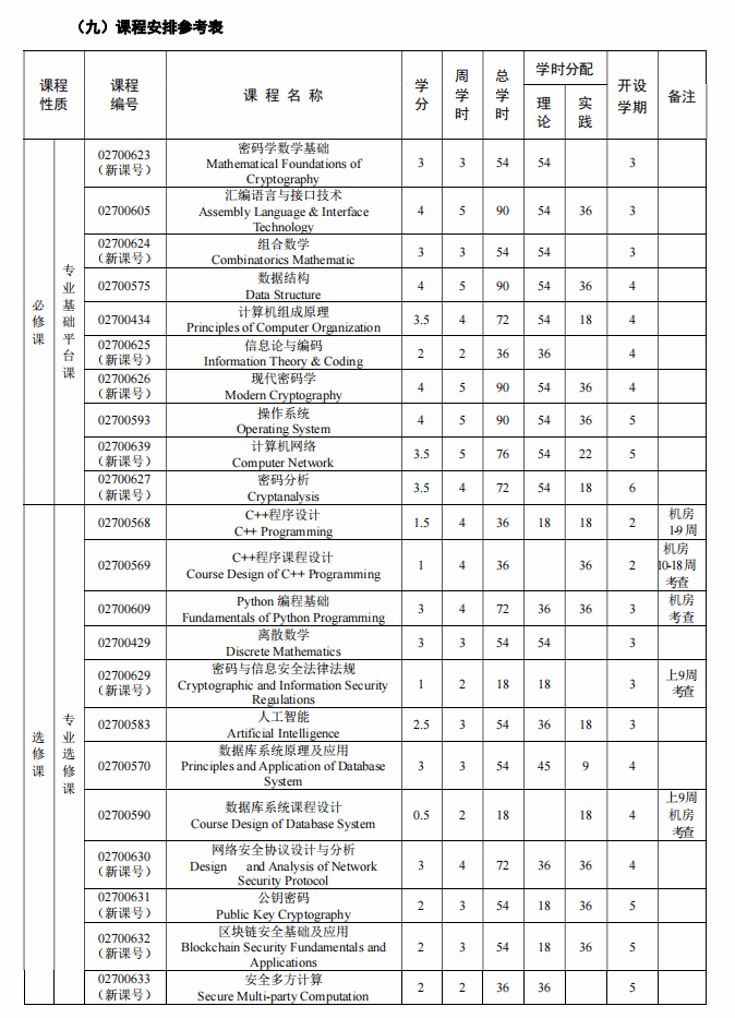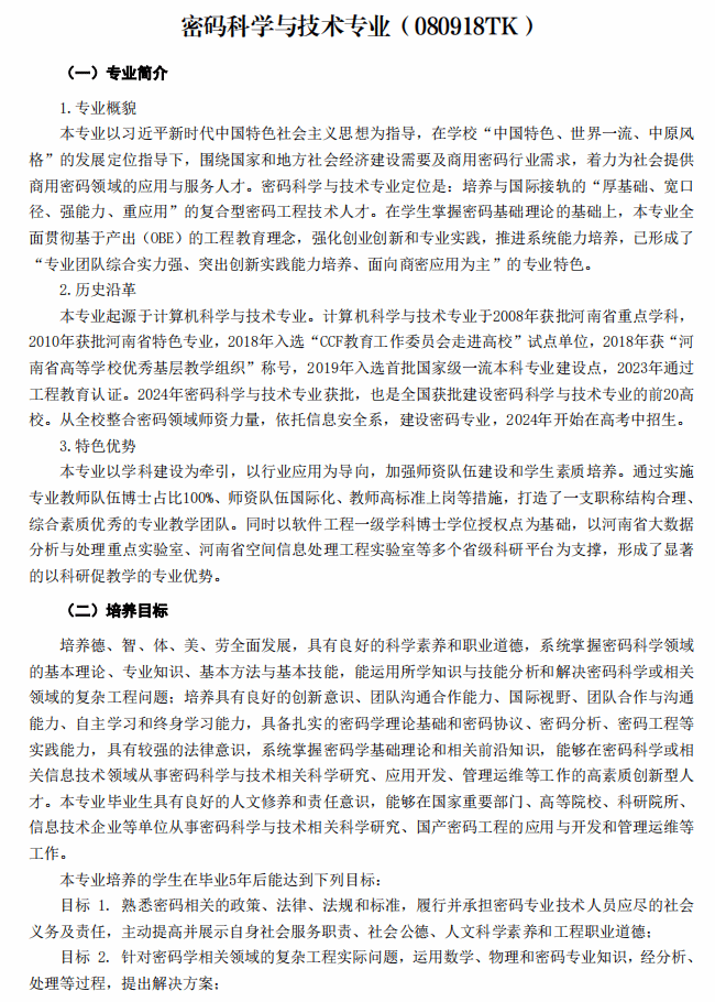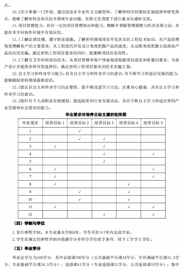 本专业毕业生具有良好的人文修养和责任意识,能够在国家重要部门、高等院校、科研院所、信息技术企业等单位从事密码科学与技术相关科学研究、国产密码工程的应用与开发和管理运维等工作。本专业基本学制为4年,学生可在3-7年内完成学业。学生在规定的弹性学制内修满学分并符合学位授予条件,授予工学学士学位。