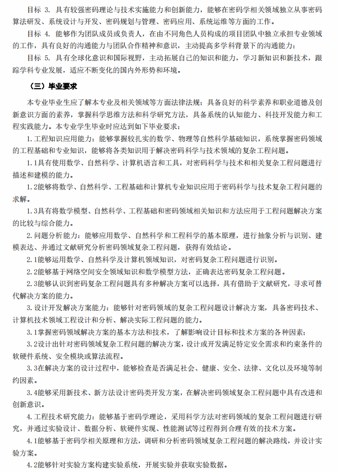 密码科学与技术专业的培养目标是:培养德、智、体、美、劳全面发展,具有良好的科学素养和职业道德,系统掌握密码科学领域的基本理论、专业知识、基本方法与基本技能,能运用所学知识与技能分析和解决密码科学或相关领域的复杂工程问题;培养具有良好的创新意识、团队沟通合作能力、国际视野、团队合作与沟通能力、自主学习和终身学习能力,具备扎实的密码学理论基础和密码协议、密码分析、密码工程等实践能力,具有较强的法律意识,系统掌握密码学基础理论和相关前沿知识,能够在密码科学或相关信息技术领域从事密码科学与技术相关科学研究、应用开发、管理运维等工作的高素质创新型人才。