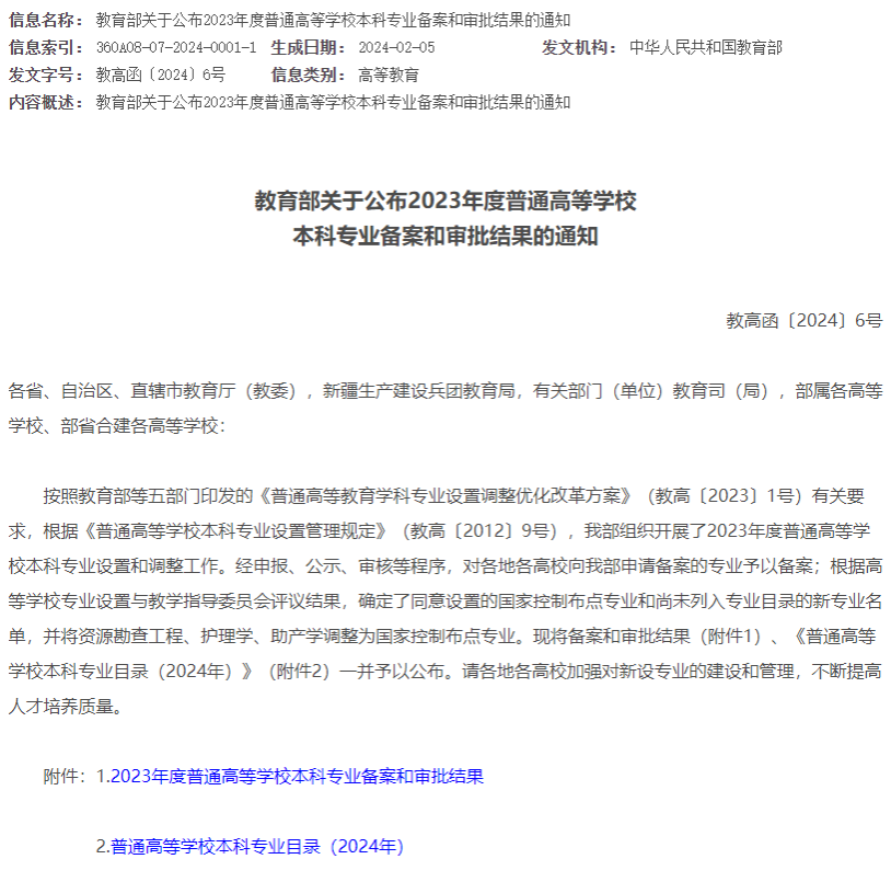 近日,教育部网站发布了《关于公布2023年度普通高等学校本科专业备案和审批结果的通知》(教高函〔2024〕6号)。麻豆成人